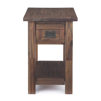 Garret Solid Acacia Wood 14 inch Wide Rectangle Rustic Contemporary Narrow Side Table. Sleek rustic contemporary design. Includes: one (1) drawer with ball bearing drawer glides & solid wood open bottom shelf. Handcrafted with care using the finest quality solid Acacia Hardwood. Assembly required. Size: 24″ d x 14″ w x 20″ h. Efforts are made to reproduce accurate colors, variations in color may occur due to computer monitor and photography. The product is warranted to be free from defects in material and workmanship for a period of (1) year from the date of purchase to the original owner.