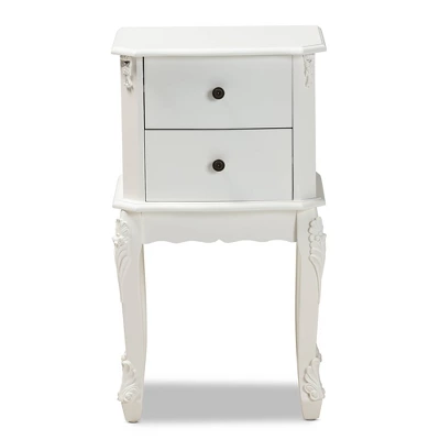 Elevate your interior with the quiet elegance of the Sophia end table. Made in China, the Sophia is fitted with two drawers to provide plenty of space for household necessities. Clean angles and stylish molding decorate the Sophia for a classic look that complements its convenient design. The Sophia requires assembly and features engraved metallic knobs for an added touch of glamour. Cabriole legs complete the look, making the Sophia a functional and stylish fit for any arrangement. Dimensions: 29.9″ high x 16.5″ wide x 12.6″ deep; Drawer dimensions: 4.7″ high x 12.6″ wide x 9.4″ deep; Legs: 12.6″ high;
