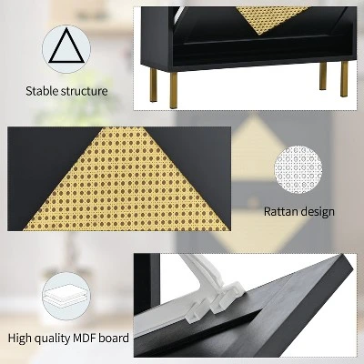 The shoe cabinet is made of high-quality rattan, which is sturdy and durable. The shoe cabinet has a modern and stylish look in sleek black tones and gold round handles. The space-saving design provides flexible storage space suitable for hallways, living rooms or bedrooms.