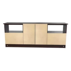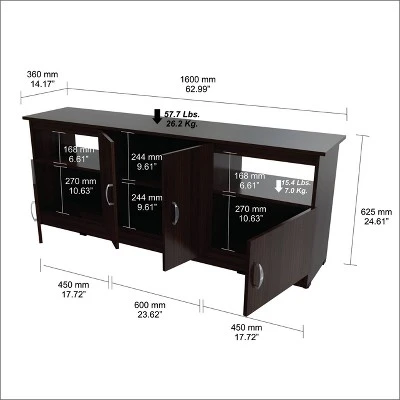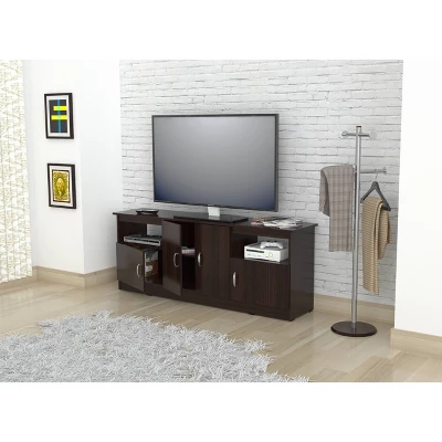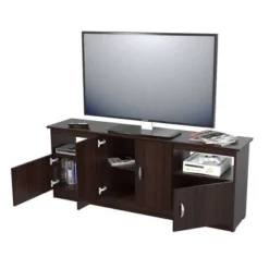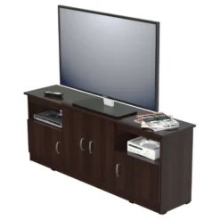 TV Stand by Inval finished in a rich “Espresso” laminates in durable melamine which is stain, heat and scratch resistant.. It has a very functional yet simple modern look to accent your home décor. The unit can accommodate up to 60″ flat-screen TVs with a maximum TV weight of 78lbs. The unit features concealed storage space behind a set of small doors and a set of large doors with brushed metal handles. Also available are two open storage compartments for additional storage or exhibition of your AV equipment. For your convenience, the back of the unit is also open for easy management cable pass through.
