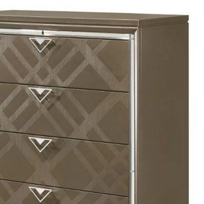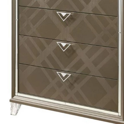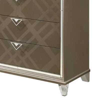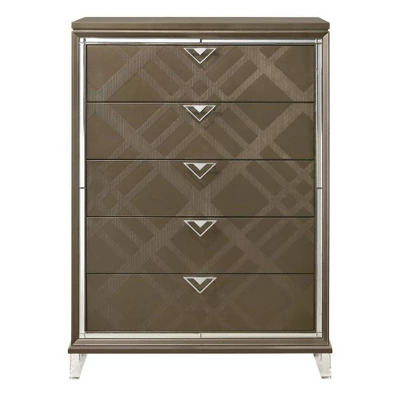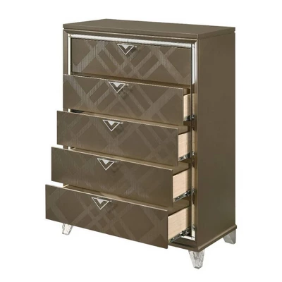 The Skylar chest is the perfect accent to create the style of vintage you ever wanted. Crafted in wood with dark champagne finish, featuring 5 drawers with safety stops for storage, embossed pull metal knob handle, mirrored beveled trim and acrylic legs, will help piling up sweet dreams layer by layer. This piece is outfited with five felt-lined drawers for safekeeping. This is sure going to bring a stunning change to your bedroom.