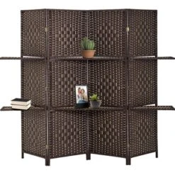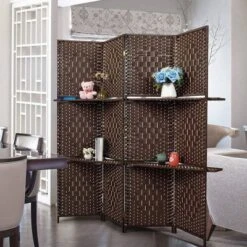Espresso Brown Paper Straw Weave with One 63 in. L Shelving 4 Panel Screen, Handcrafted. This handcrafted espresso brown finish room divider which combine with the shelf is great for placing favorite decorative items to style the room. Divider enables for individuals to keep a safe zone and to keep privacy from visitor’s view. The divider is made up of four panels and hinges for easy folding in both directions. Convenience to fold and put away if not in use. This Room Divider is an excellent item to have in your home.