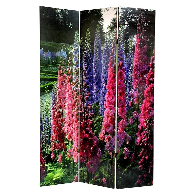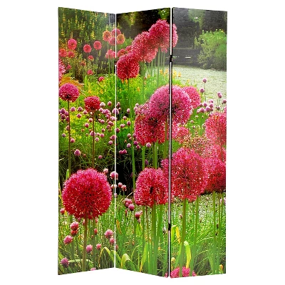This is a bright, beautiful floor screen printed on one side with pink and purple snapdragons and on the other side with large striking fuchsia pompom flowers. Each panel has full 360 degree movement and can be displayed in a variety of arrangements. This stunning decorative accessory is perfect for adding both color and a calm beauty to home or professional office space.