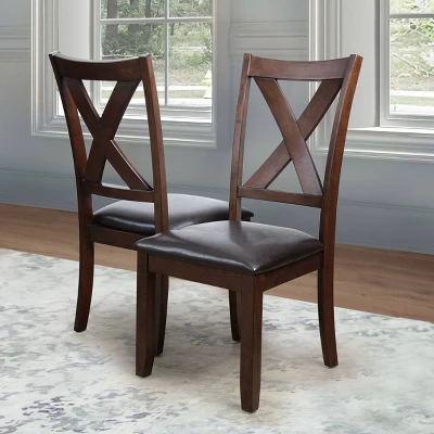 Welcome guests to the heart of your home during dinner parties with this seven-piece dining set. Crafted from a blend of solid and manufactured wood, it showcases a dark brown or gray finish for a touch of traditional appeal. Its six side chairs boast black faux leather upholstery for an updated touch, while their open X-shape backs bring an interesting focal point to your ensemble.
