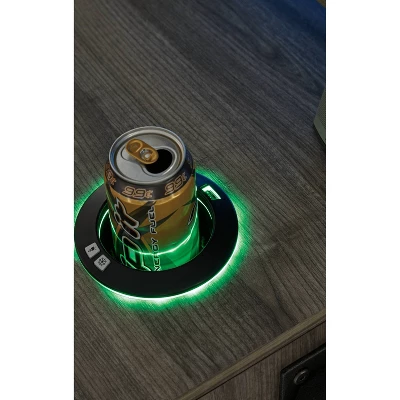 Elevate your style and up your game with the ultra-cool Barolli gaming desk. Clean and contemporary, this mixed media designer desk includes a metal frame in silvertone finish, topped with an engineered wood surface with replicated wood grain. Setting you up for success: a large open raceway for power cord management, desk top monitor shelf and an LED back light with multiple color options for an enhanced gaming experience. Along with a PC stand for easy access, this gaming desk features a custom designed headset hanger and a built-in electric can cooler with USB plug-in. Signature Design by Ashley is a registered trademark of Ashley Furniture Industries, Inc.