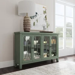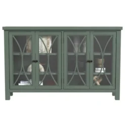 - Four decorative glass pane doors hide a removable shelf, making this cabinet an ideal home storage solutions or as an accent piece