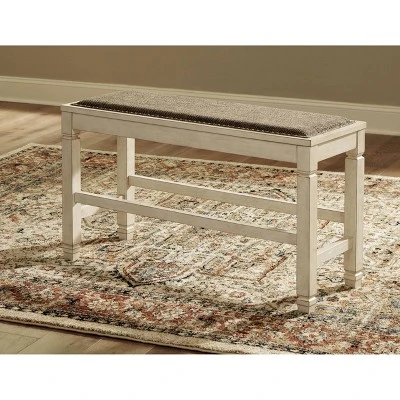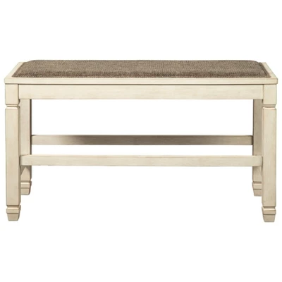 The beauty of this upholstered dining bench is something to savor. Serving up comfort and flair, this generously scaled counter-height bench entices with a cushioned seat covered in a heavy woven fabric that complements the antiqued white finish. Signature Design by Ashley is a registered trademark of Ashley Furniture Industries, Inc.