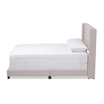 Add a chic, sleek vibe to your bedroom or guest room with the Brady bed. The modern and contemporary-inspired design is evident in the clean lines and chic details of the bed. The Brady’s frame is built to last with a rubberwood and poplar construction. The feet of the bed are finished in , complementing the neutral fabric upholstery of the frame and headboard. The headboard of the Brady features a straight headboard silhouette and wings for an eye-catching look. The headboard also features button-tufting and chrome finished nail head trim on the wings. The Brady is made for use with a box spring and mattress. Made in Malaysia, the bed requires assembly.