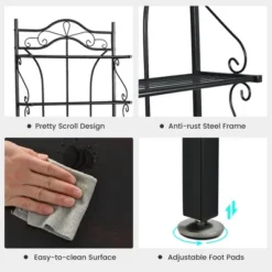- Sturdy Construction & Durable Material: Constructed from heavy-duty steel with plastic-sprayed surface, this kitchen baker’s rack is rather sturdy and durable. The adjustable foot pads cope with uneven floor for added stability. What’s more, you can attach the shelf to the wall with the anti-toppling device to increase safety and stability.