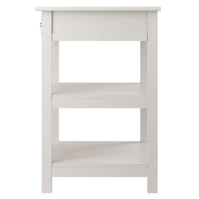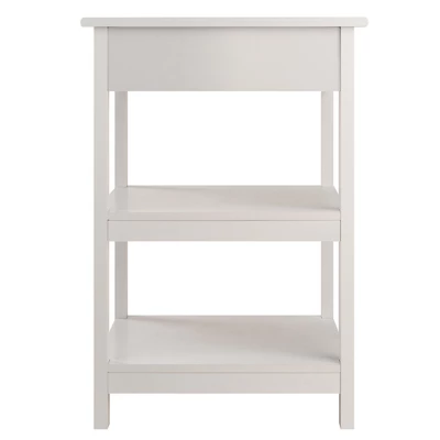 The table features a soft-close drawer with a silver accent pull and two open shelves that provide plenty of storage space. Made of composite wood in White finish. Assembly required.