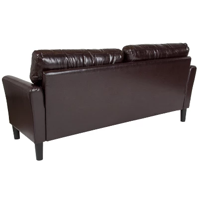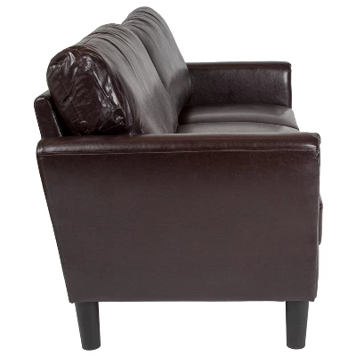 Great taste never goes out of style so let yours shine through with this casually constructed black LeatherSoft upholstered sofa. Generously padded with with 4.5 inches of CAL 117 fire retardant foam, this faux leather settee will add a refined look to your home furnishings. The oversized back cushions are removable for cleaning and have a hook and loop system to keep them in place. The fixed seat cushions stay in place to prevent slippage for a neat, clean look. Upholstered tailored arms allow you to relax and relieve pressure from your neck and shoulders. Sinuous steel wire seat springs provide an excellent seating experience while soft and durable LeatherSoft upholstery adds warmth and comfort that will make guests feel welcome. High rounded black plastic legs not only enhance the look of this 3 seater couch, they also make it easier to sweep, mop or vacuum underneath. Spills and other messes clean up easily with a water based cleaner. Pair with our glass coffee table to complete the look. Additional Features: Generously Padded with CAL 117 Fire Retardant Foam, Sinuous Steel Wire Seat Springs for a comfortable seating experience, Rounded Black Plastic High Legs makes it easy to sweep or vacuum underneath, Spot Clean with Water Based Cleaner to remove spills, LeatherSoft is leather and polyurethane for added Softness and Durability.