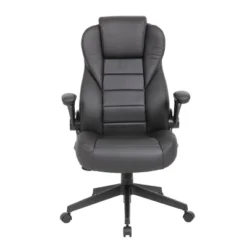 Our high back executive LeatherPlus chair is the perfect compliment to any office. Upholstered with beautiful black LeatherPlus, a combination of leather and polyurethane that promotes exquisite softness and durability, this chair is more than capable of taking comfortable seating to a new level. Additional features include passive ergonomic seating with integrated lumbar support, padded flip arm armrests covered in the same elegant upholstery, an upright locking position, pneumatic gas lift seat height adjustment, spring-tilt mechanism, and adjustable tilt tension control.