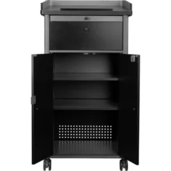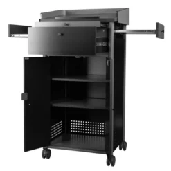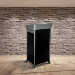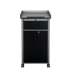 The graystone Lectern from Oklahoma Sound is far more than just a basic lectern. This elegantly designed unit offers an all-in-one presentation experience. Large reading surface (22.75”W x 18.25”D), two side pull-out shelves (14.25”W x 12”D), and a sliding keyboard tray (17.5”W x 9.25”D) provides for a complete multi-media presentation experience. Designer curved Gray plywood adds a sophisticated look. The cabinet includes three large shelves plus an oversized front drawer for ample storage. 2.5” hooded twin wheel matching casters makes for easy mobility. Elegance & functionality for all your presentation needs.