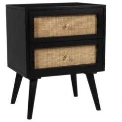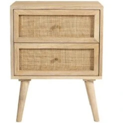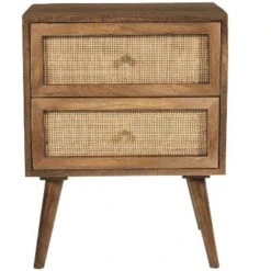 The Serafina 2-Drawer Nightstand is the perfect combination of rustic meets modern design. It features 2 spacious drawers with a real woven cane facade accenting each one. Its earthy appearance is further emphasized by its natural solid mango wood frame. Supported by a stylish splayed 4-legged base design, it is exceptionally crafted for long-lasting use. Each drawer has a centered round peg handle for easy handling. Its smooth surfaced top has enough room to be used for both your reading lamp and for your nighttime literature. Its a remarkable blend of clean-cut geometric and industrial raw design with the option of choosing a frame finish that meets your style preference. This modern nightstand will make your bedroom a better, more beautiful place to sleep in.
