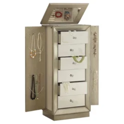 Keep your jewelry organized and tucked away with the radiant Gold Jewelry Armoire from Acme Furniture. This wood armoire features a subtle gold finish, adding a touch of shine to your space, whether it’s in your bedroom, closet or bathroom. Two doors along each side swing open to reveal hooks to hold necklaces and prevent them from tangling. Six drawers are perfect for stashing scarves, belts and more. Lift up the top to reveal a mirror and more storage space with rolls for rings, and other compartments for bracelets.