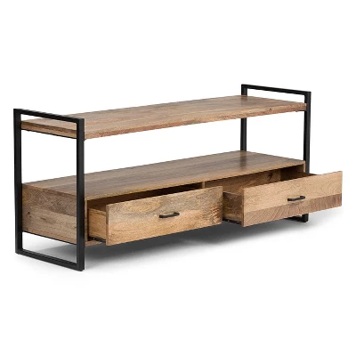 - Features two (2) large drawers, large open shelf, metal frame and drawer pulls in a black finish
