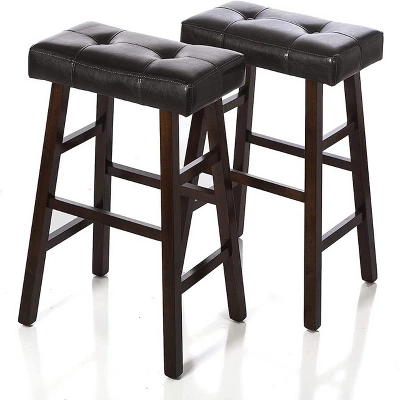 These Espresso/Brown Counter height Bar Stools will add stylish seating to any counter height table in your home. The sturdy wood frame has an espresso finish accented by an espresso faux leather upholstered tufted seat. The double needle stitching adds durability to the padded top for eye-catching detail. Set of 2 same height stools. You can select the seat height that fits your table. 24” High seat is for Counter Height seating.