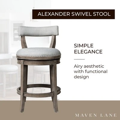 Introducing the Maven Lane Alexander Low Back Swivel Counter Stool 26-inch, a classic stool design with modern flair. The Alexander Stool is designed to elevate your kitchen or counter space while providing a second–to–none seating experience.Crafted from solid kiln-dried hardwood with mortise and tenon joinery, this stool is both beautiful and built to last. The premium upholstery and high-density foam cushions ensure maximum comfort, while hand-applied nail head trim, refined silhouette, and precise craftsmanship add timeless style to your home.With a smooth swivel return mechanism that rotates 180 degrees, getting in and out of this stool is effortless. Assembling this stunning piece requires only two simple steps, with all the necessary hardware and a detailed instruction manual included.Transform your kitchen or dining area into a cozy haven with the Maven Lane Alexander Low Back Swivel Counter Stool 26-inch, a piece that will endure for years to come.
