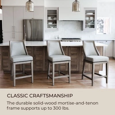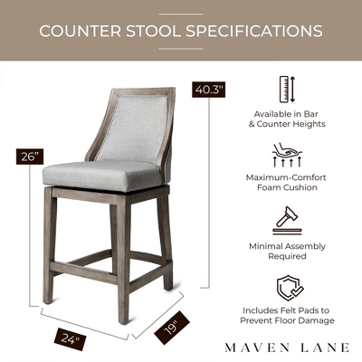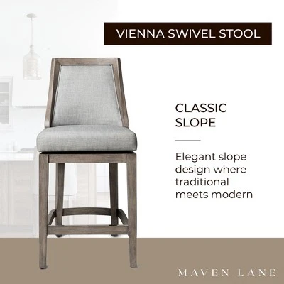 Introducing the Maven Lane Vienna Swivel Counter Stool 26-inch. This timeless piece features rustic aesthetics and a beautifully exposed wood frame. The stylish Vienna Stool will quickly become your new favorite place to sit.Crafted from solid kiln-dried hardwood with mortise and tenon joinery, this stool is both beautiful and built to last. The premium upholstery and high-density foam cushions ensure maximum comfort, while the high back design, exposed wood frame, and precise craftsmanship add timeless style to your home.With a smooth swivel return mechanism that rotates 180 degrees, getting in and out of this stool is effortless. Assembling this stunning piece requires only two simple steps, with all the necessary hardware and a detailed instruction manual included.Transform your kitchen or dining area into a masterpiece with the Maven Lane Vienna Swivel Counter Stool 26-inch, a stool that will endure for years to come.