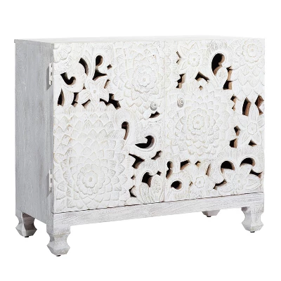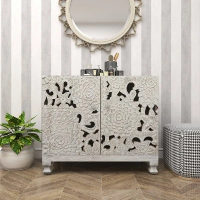 - A rectangular cabinet highlighting 2 cabinet doors with floral patterns and cut-out design