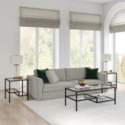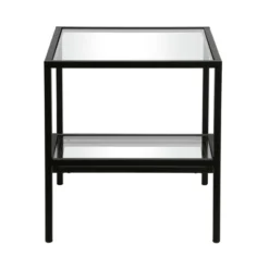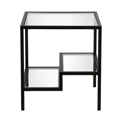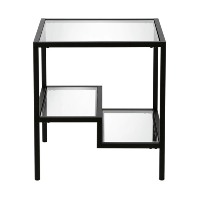 This contemporary side/end table is the perfect addition to your living room or bedroom ensemble. A blackened bronze metal frame borders the glass table top and two-tiered shelves. Balanced on four legs, the table can hold a weight capacity of 15 LBS.Features : Hand crafted blackened bronze finish is applied to the steel frame.Clean with a soft, dry cloth; no harsh chemicals or abrasive cleaning materials.Features easy assembly.Weight capacity can support up to 20 LBS.Premium materials have been used in the making of this productSpecifications : Product Weight : 22.9 lbsFrame Material : Metal
