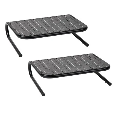 Instantly improve viewing and posture by raising computer monitors, flat screen tv or displays, laptops, printers, iMac Monitors, Desktops and more. Strong, durable and stylis, this set of 2 metal monitor stand pair holds up to 44lbs (20kg) each, fit most flat screen display monitors or televisions, laptops, printers and more, with ventilated metal mesh construction to prevent devices from overheating. Helping with STRESS AND NECK PAIN REDUCTION, each Erogonomically constructed riser lifts computer monitors, laptops and tv displays to a comfortable viewing position for more optimal viewing height and Improved neck position – helps to reduce back pain caused by poor posture while working. The NON-SLIP DESIGN offers rubber pads built into the monitor legs to reduce shifting of risers stands while sitting on table or desk surfaces – solid and sturdy metal vented construction is optimal for home and office use. PERFECT FOR HOME AND OFFICE USE – enjoy improved performance and work efficiencies with these monitor or tv stands while you work or watch tv – store keyboard and supplies under monitor riser – LED, LCD, OLED Flat Screen Displays, iMac, desktop PC and more. The ultimate SPACE SAVING and use VERSATILITY – Computer and monitor risers create additional storage on your desk, table or home entertainment furniture by raising your device off of the surface – store magazines, videos and more under stand riser. Gain additional ORGANIZATIONAL AND STORAGE efficiencies on your work desk or home office – add more desk surface by lifting your monitor up onto a desktop or tabletop stand – store pens, pencils and office supplies underneath. REDUCING EYE STRAIN is a common problem facing people who work in front of a screen all day. Creating an optimal work or entertainment viewing experience is critical for eye, neck and back strain – sitting at the recommended distance from your device will help to reduce pain due to poor posture. The ULTIMATE STUDENT MUST HAVE – The perfect addition to any dorm room – create a comfortable and safe study environment for hours of studying on computer or tablet device or for TV viewing with friends – THIS 2-pack for computer and tv is a must have for back to school supplies or gift for any student. Each Mind Reader mesh vented metal riser measures approximately 15″ wide x 11″ long x 3″ high. Keep your monitor stand riser clean with damp cloth for long lasting use and storage as needed. No assembly required, simply open and remove from box and use immediately. Available in Black. Includes 2 monitor stand risers.