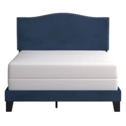 Beauty commences with the Kiley upholstered bed. With a casual design and covered in an exquisite plush blue colored upholstery, this queen size bed is the definition of sophistication and the perfect addition to your bedroom. The headboard features sharp angles at the corners with a visible arch in the middle — as well as nail head trim around the edges. Shipping in one box, the bed frame is made of study wood including slats and center leg supports. Box spring and mattress required; not included. Assembly required.