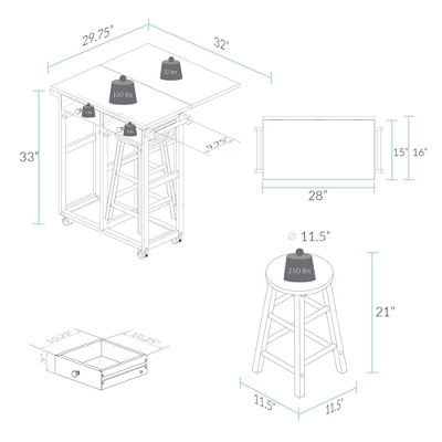 Crafted from all-natural solid wood, this breakfast cart comes with two separate barstools made with a hardwood top. This space saver comes with two drawers, two towel handles, and a barstool storage compartment. The drop-leaf style tabletop is a versatile rendition of the traditional breakfast table. Designed with a square-shaped top to maintain a balance of proportion, it’s purposefully modest and mobile. And it’s an ideal space-saving solution for the modern-day kitchen. Use it as a breakfast nook, mini bar, or a cozy dining area.