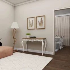 - •Long console table carries brown table top with natural wood grain and a distressed eggshell white base