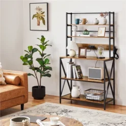 - Crafted with a sturdy steel frame, this piece uses superior particle board tabletop and shelves. The utility storage shelf offers four multi-sized shelves to organize your go-to kitchen needs like kitchenware or spice jars and smaller appliances like microwaves, coffee makers. The distressed brown color of this kitchen utility storage shelf can coordinate with a variety of styles, especially rustic barn-style and industrial design.